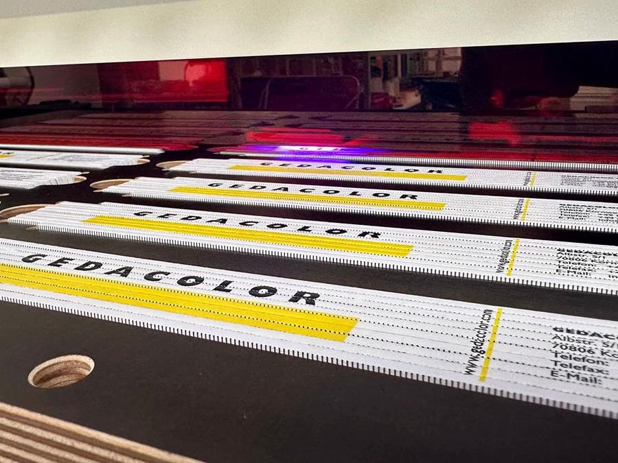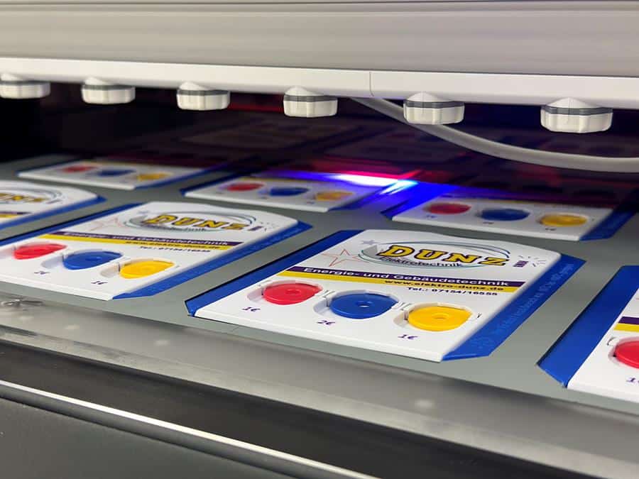 Mit unserem leistungsstarken UV-Direktdrucksystem realisieren wir brillante, langlebige Drucke direkt auf flachen und geformten Objekten – ganz ohne Folie oder Transferverfahren. Ob funktionale Bauteilkennzeichnung oder individuelle Werbemittel: Der Druck erfolgt direkt auf das Material, hochauflösend, beständig und effizient.